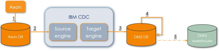 In contrast to Data Mart 1.0’s proprietary file based data transfer, DM2 is based upon standard IBM replication tooling (CDC) and follows transactional data as it is added or changed in the Axon database. This results in a better performing, faster (near real time) and more stable data feed. DM2 will also increase the scope of data available for reporting as all relevant Axon data will be available in DM2 including intermediate status of data changes throughout the day.